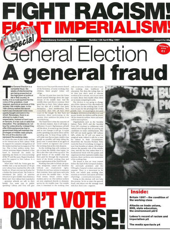 FRFI contentOur Paper FRFI 136 Apr/May 1997 – General Election: A general fraud – Don’t vote organise! By FRFI 5 April 1997 General Election: A general fraud Manifesto for action The condition of the working class Destroying the environment The attack on trade unions Attacking the NHS The end of council housing Labour: a racist party Imperialist Labour Organising in Scotland Labour and prisons Law and order Kids are ‘Alright’ The spectacle Share FacebookTwitterWhatsAppReddItPrintCopy URL Related articlesContinue to the category FRFI content FRFI! 308 October/November 2025 – Imperialist war criminals hands off Gaza FRFI content FRFI! 307 August/September 2025 – Palestine solidarity under attack FRFI content FRFI! 306 June/July 2025 – Palestine no solution but liberation FRFI content FRFI 305 April/May 2025 – Free Palestine – Fight state repression FRFI content FRFI 304 Feb/Mar 2025 – Long Live Palestine Long Live Gaza Our Paper FRFI 303 Dec 2024/Jan 2025 – End British support for genocide
