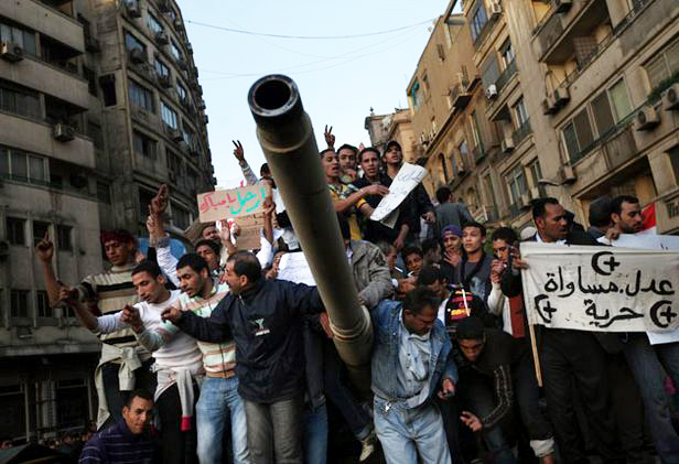 Protests, inspired by the Tunisian revolt, began on 25 January, and gathered momentum until, on 28 January, hundreds of thousands of people poured onto Cairo’s streets and converged from all directions on Tahrir Square in the centre of the city. Street fighting with thousands of plain-clothes and uniformed police ensued. The government had shut down the internet and mobile phone networks, but to no effect. Police rained down tear gas canisters, drenched demonstrators with water cannon, fired rubber bullets, stun grenades and live ammunition; still they were forced to retreat as the people occupied the Square – a symbolic victory – ‘Mubarak, Mubarak, Saudi Arabia is waiting for you’, they shouted for the Egyptian President to go. The headquarters of the ruling National Democratic Party was set ablaze and police stations were torched.