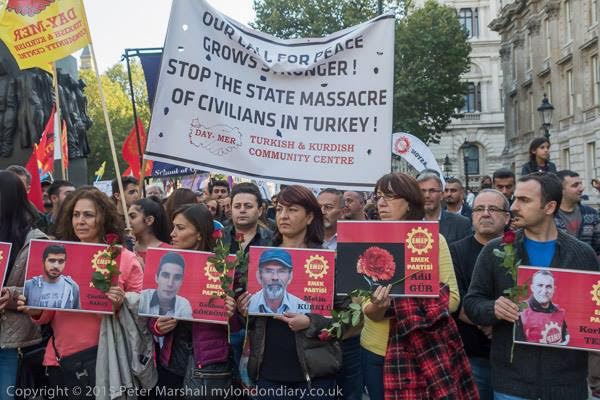 The rally was organised in the run-up to the Turkish general election on 1 November to call for peace and for an end to attacks by the AKP government on Kurdish areas in Turkey and Iraq and on Kurdish political representatives in the HDP. Since the previous election result on 7 June where the AKP failed to get the majority it hoped for, it has launched an all out war on the Kurdish people and their organisations (see FRFI 246).