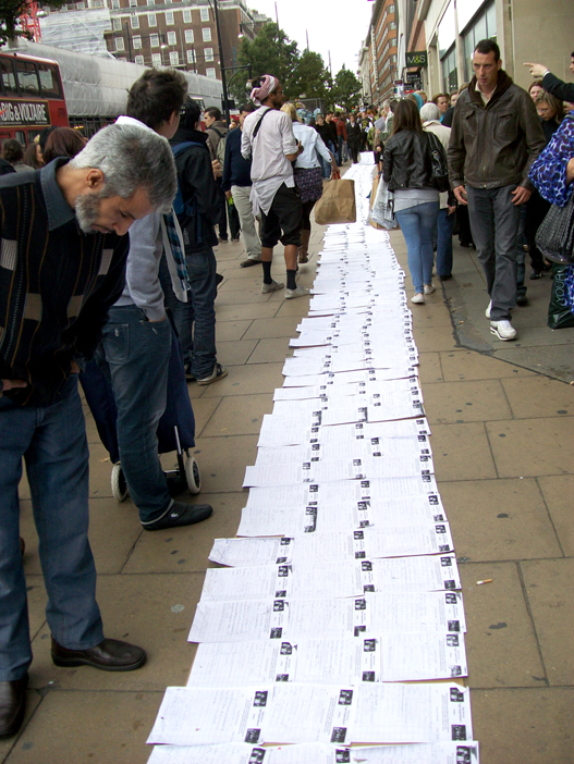 Sept 2010: Victory to the Intifada activists unravel a sample of the thousands of petitions they have collected over the last ten years with signatures of those opposing Marks & Spencer”s links with the racist state of Israel. The picket outside M&S in Oxford Street, London, marked the 10th anniversary of the intifada.