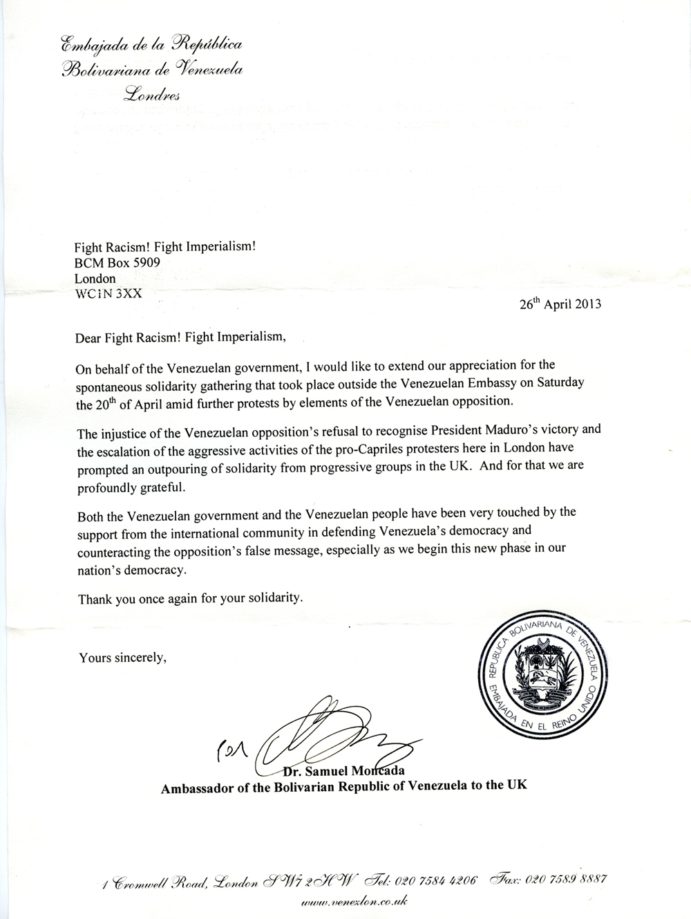 Below we reproduce a letter from the Venezuelan ambassador thanking Fight Racism! Fight Imperialism! for the actions of its supporters in defending the embassy against a mob of counter-revolutionaries on 20 April (Protest to defend the Venezuelan embassy)