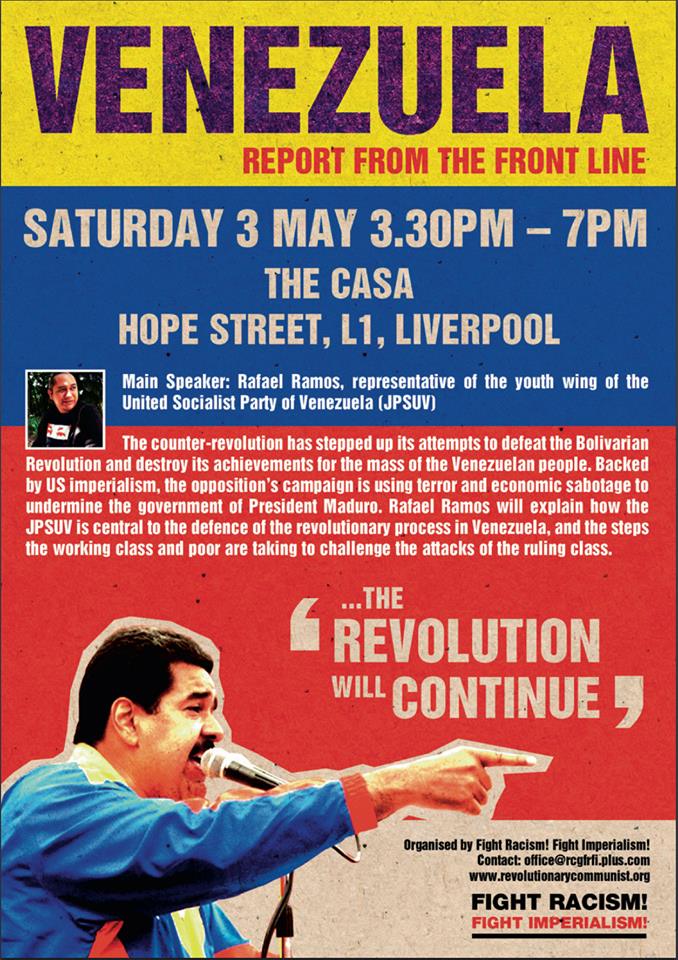 Venezuela, alongside socialist Cuba, is spearheading the movement for socialism in Latin America, challenging imperialism and neo-liberal exploitation, demanding dignity and human development over profit and private interests. The Bolivarian Revolution remains a beacon of hope and inspiration for movements across the globe. It must be defended. Rafael Ramos will speak about the struggle to build socialism in Venezuela and the threat from imperialist-backed opposition groups whose violence has claimed many lives in recent months.