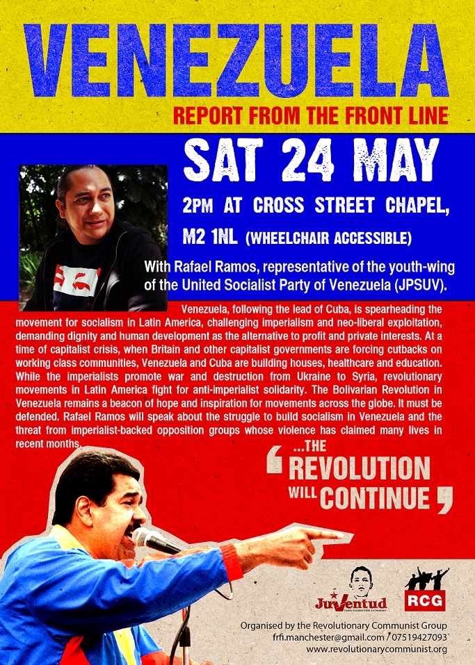 Venezuela, alongside socialist Cuba, is spearheading the movement for socialism in Latin America, challenging imperialism and neo-liberal exploitation, demanding dignity and human development over profit and private interests. The Bolivarian Revolution remains a beacon of hope and inspiration for movements across the globe. It must be defended. Rafael Ramos will speak about the struggle to build socialism in Venezuela and the threat from imperialist-backed opposition groups whose violence has claimed many lives in recent months.