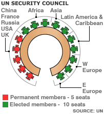 The five permanent members of the Security Council are the U.S., U.K., France, Russia and China, while other countries are elected to the ten non permanent seats on a rolling basis of five per year.